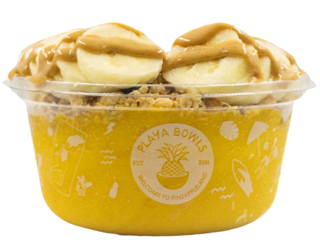 Playa Mango with vanilla protein topped with blueberry flax granola, banana, and peanut butter